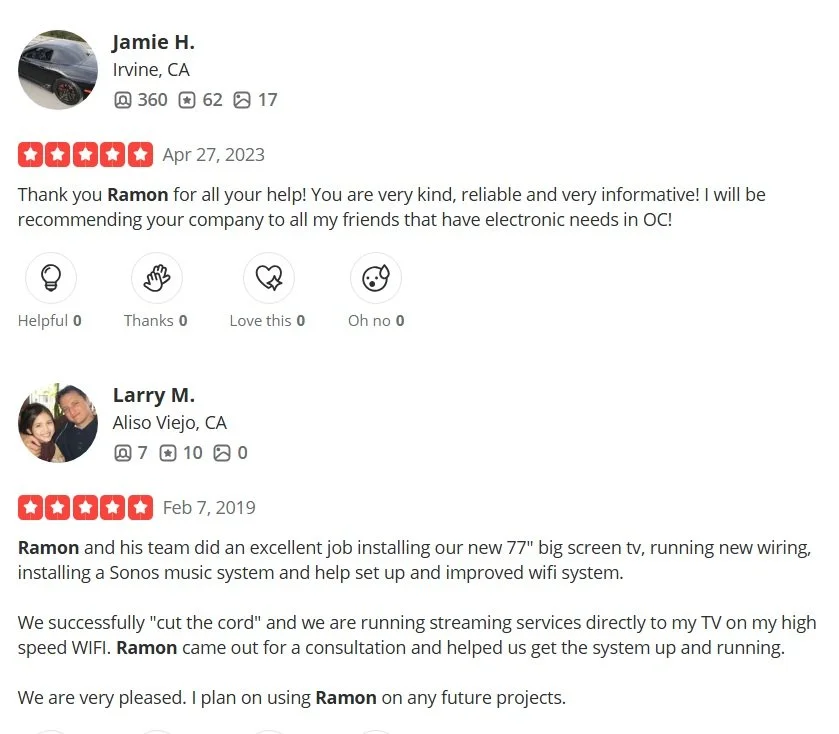 No matter if your system needs a little improvement or a complete update, we’re here to make sure you get the best results. For over 10 years, we’ve been helping families and businesses across South Orange County enjoy reliable audio and video solutions.